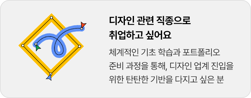 ⓘ 확인해 주세요 | Basic Class는 디자인 기초 이론 및 원리 수업으로 진행됩니다. (※ 디자인 툴 사용법 및 포트폴리오 제작은 포함되지 않습니다) 1) 포트폴리오 제작을 원하시는 분은 A Class 또는 B Class를 신청해 주시기 바랍니다.2) 정확한 학습 수준 진단과 맞춤형 수업 안내를 위해, 강의 신청 전 무료 상담을 먼저 받아보시길 권장드립니다. 개인별 학습 목표에 맞는 클래스를 안내해드리겠습니다. |