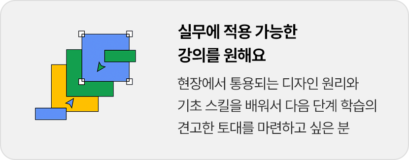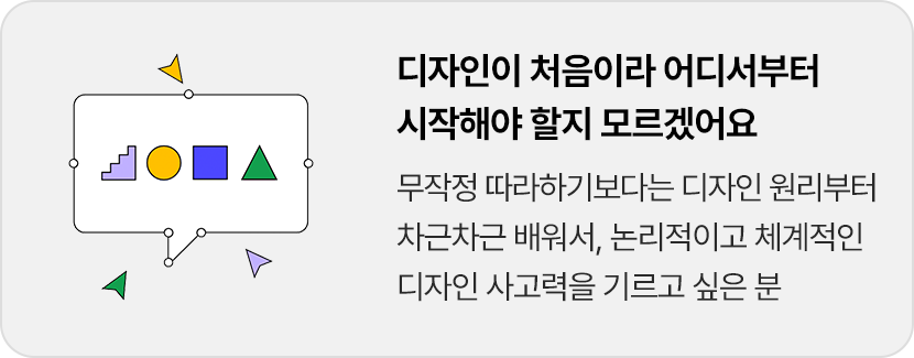 Basic Class는 디자인 기초 이론 및 원리 수업으로 진행됩니다. (※ 디자인 툴 사용법 및 포트폴리오 제작은 포함되지 않습니다)