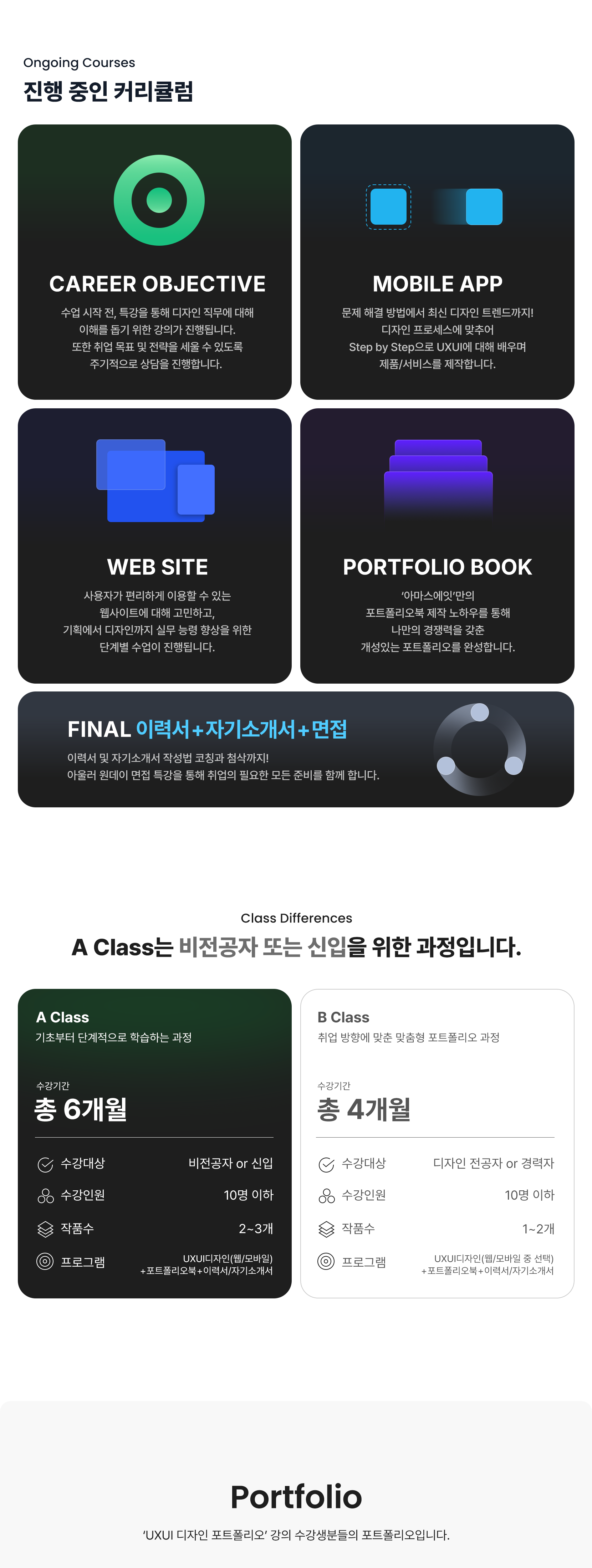포트폴리오 강의 수료 후에도 취업 지원 프로그램을 통해 학생들이 원하는 분야에 성공적으로 진출할 수 있도록 돕습니다.